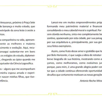 Destaque para dois capítulos especiais: “Saudades do Bonde” do escritor Luiz Onofre Miranda, que descreve em versos, de forma genial o passado da Capital Mineira e, “Edifício Acaiaca – um case a parte”, onde o leitor poderá perscrutar o futuro com os arrojados projetos de ressignificação do “gigante” e sua inevitável e benéfica influência na revitalização de todo o hipercentro de Belo Horizonte.